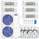 This 4th Generation MRCOOL Mini Split system provides everything necessary to efficiently heat and cool five distinct rooms. Included in the package are: a DIY 48,000 BTU Multi-Zone Condenser, three 9,000 BTU Wall Mounted Air Handlers, two 12,000 BTU Wall Mounted Air Handlers, five Remotes, and five 16 ft. Installation Kits. The highlight of this system is its DIY installation capability, allowing you to set it up yourself.