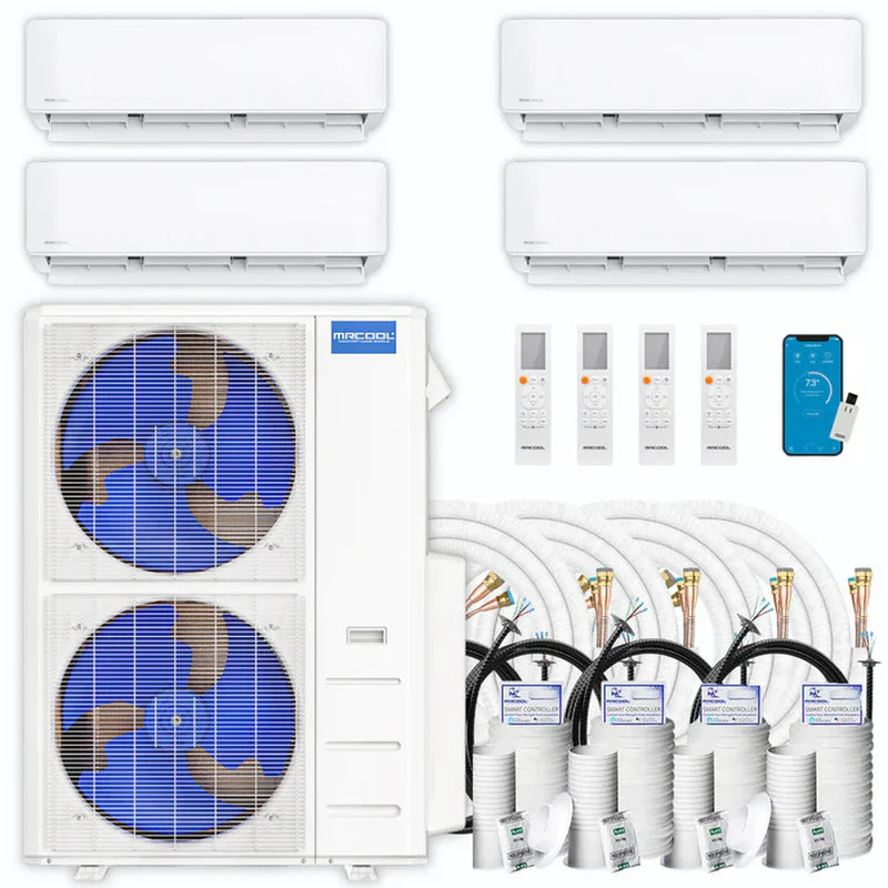 Introducing the 4th Generation MRCOOL Mini Split, a comprehensive solution designed to cool and heat up to four separate rooms effortlessly. This package includes the following components: